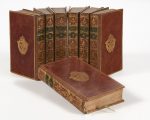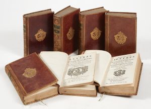 7 volumes in-12 [163 x 95 mm] de (2) ff., 374 pp., (1) f. ; (2) ff., 295 pp. ; (3) ff., 550 pp. ; (4) ff., 491 pp., (3) pp. de privilège ; (1) f., 448 pp., (4) ff. d'avertissement et de table ; (4) ff., 386 pp. ; (4) ff., 384 pp. mal chiffrées 383 sans manque : veau porphyre, dos lisses ornés avec, en pied, la mention "C.T." [Château de Trianon] couronnée et dorée, pièces de titre et de tomaison de veau vert, triple filet doré encadrant les plats avec armes dorées au centre, coupes filetées or, bordures intérieures décorées, tranches mouchetées (reliure de l'époque).