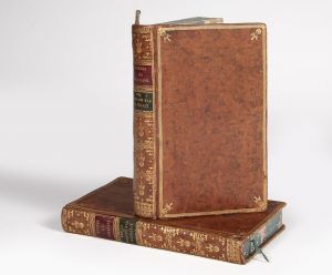 marbré, dos lisses ornés, pièces de titre portant "Œuvres de Voltaire" et de tomaison de maroquin rouge et vert, triple filet doré encadrant les plats, pièces d'armes dorées sur le dos et dans les angles des plats, coupes filetées or, tranches marbrées (reliure de l'époque).