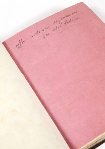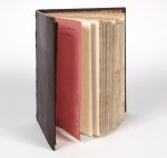 Demi-chevrette prune à coins, dos à quatre faux nerfs richement orné or et à froid, roulette à froid sur les mors et fleurons à froid sur les coins, entièrement non rogné, premier plat de la couverture muette de papier rose conservé (reliure de l'époque).