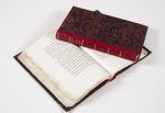 dos lisse en basane rouge (orné de quelques filets dorés et fleurons à froid) aux coutures assez souples qui permettent une bonne ouverture du livre, celui-ci non rogné, à pleines marges, et largement protégé par des plats plus grands revêtus de papier marbré, les gardes étant toujours de papier blanc sur lequel il serait possible d'écrire" (Thierry Bodin).