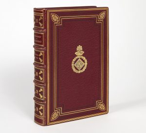 dorés dans les angles et armes dorées au centre, coupes filetées or, dentelle dorée d'encadrement intérieur, tranches dorées, couverture et dos conservés (M. Lortic).