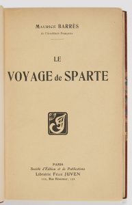 BARRÈS, Maurice. Le Voyage de Sparte. Paris, Librairie Félix Juven, 1906. In-12 [187 x 118 mm] de 300 pp., (2) ff. : Demi-maroquin tabac à coins, dos à nerfs orné, non rogné, tête dorée, couverture et dos conservés (Semet & Plumelle).