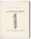 VALÉRY, Paul. La Jeune Parque. Paris, Éditions de la Nouvelle Revue Française, 1917. In-4 [238 x 187 mm] de (24) ff. : Maroquin rose cyclamen, décor irradiant sur les deux plats, se poursuivant sur le dos, nom de l'auteur et titre en lettres...