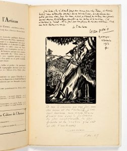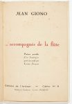 GIONO, Jean. ...accompagnés de la flûte. Poêmes [sic] précédés d'un frontispice gravé au canif par Lucien Jacques. Grasse, Éditions de l'Artisan [Saint-Brieuc, Imprimerie moderne], 1924. In-4 [282 x 188 mm] de 24 pp. y compris le premier...