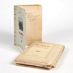 KAFKA, Franz. Le Procès. Paris, Gallimard, 1933. In-12 [185 x 118 mm] de (4) ff., XIX pp., pp. [9] à 283, (1) f. : Broché, couvertures bleu-gris imprimées en rouge et noir, sous étui-chemise de Devauchelle.