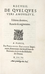 [BERTAUT (Jean)]. Recueil de quelques vers amoureux. Edition derniere, reveüe & augmentee. Paris, Philippe Patisson, 1606. In-8, maroquin bleu, triple filet, dos orné d’un semé de fleurs de lis, dentelle intérieure, tranches dorées...