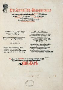 BOUCHET (Jean). Les Annalles Dacquitaine, faictz & gestes en sommaire de Roys de France et Dangleterre, pays de Naples et de Milan, reveues et corrigees par Lacteur mesmes jusques en lan Mil cinq cens trente sept, & de nouvel jusques en lan Mil cinq...