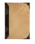 serties de laiton encadrant à niveau les pièces d’attache de veau brun criblé, en arc-de-cercle et triangle (inversées au second plat), au coin, des pointes «sèches» traitées dans le même esprit, couture sur deux lanières de veau brun sombre, dos de vachette beige, claies ton sur ton en tête et queue, gardes de vachette beige cendrée.