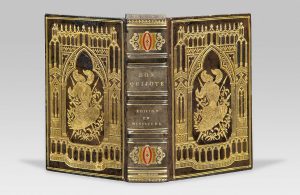 portrait de profil de Don Quichotte et trophée d’armes, dos à trois nerfs orné de filets et roulettes, deux fleurons dorés et mosaïqués de rouge et d’ocre, roulette intérieure, tranches dorées (Simier R. du Roi).