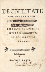 ÉRASME. De Civilitate morum puerilium. Mediolani [Milan], Apud Antonium Castellionaeum, 1539. Petit in-8, veau brun, double encadrement de filets à froid, petit fleuron doré aux angles, dos à trois nerfs, (Reliure moderne dans le goût de...
