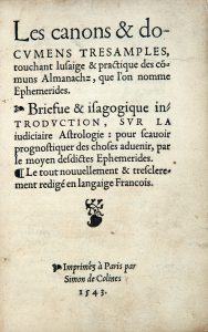 On y trouve également une Briefve & isagogique introduction, sur la iudiciaire Astrologie : pour sçavoir prognostiquer des choses advenir, par le moyen desdictes Ephemerides.