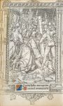 ♦ Chaque page est ornée de bordures composées d’arabesques, scènes bibliques et des deux danses des morts, celle des hommes (30 figures) répétée trois fois, et celle des femmes (36 figures) répétée deux fois et demie, soit en tout 132 bois. On remarque également une chasse au cerf.