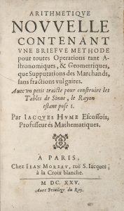 HUME (James). Arithmétique nouvelle contenant une briefve méthode pour toutes Opérations tant Astronomiques, & Geométriques, que Supputations des Marchands, sans fractions vulgaires. Avec un petit traicté pour construire les Tables de Sinus, le...