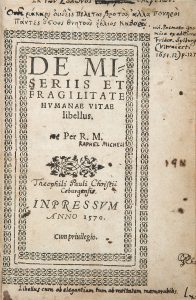 Ainsi, le De miseriis et fragilitate humanae vitae est dû à l’écrivain belge Melchior Barlaeus, paru chez Plantin en 1566.