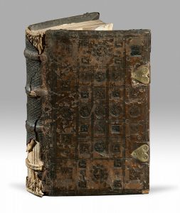 ► TRÈS INTÉRESSANTE RELIURE ESTAMPÉE DE L’ÈPOQUE, PORTANT, PARMI UN SEMÉ DE GROS FERS ANIMALIERS, RÉPÉTÉES AUX ANGLES, LES ARMES DE VIENNE, EN DAUPHINÉ.