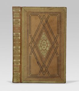 In-8, veau blond, encadrement orné de sept filets dorés et d’une mince roulette à froid, jeu de doubles filets noirs entrelacés et disposés autour d’un cartouche doré, le tout formant panneau central, dos orné, roulette intérieure, doublure et gardes de soie moirée bleu ciel, tranches dorées (R. P. Lesné F.).