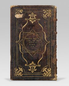 dans une composition autour d’un cercle de deux carrés entrelacés dont l’un posé en losange, nom de l’auteur et titre dans le cercle, autour de cette composition grands fers en accolade, fleuron aldin en tête et en queue, ex-libris GROLIERII ET AMICORUM en bas du premier plat, même décor au second plat, devise frappée au centre PORTIO MEA DOMINE SIT IN TERRA VIVENTIUM, dos à quatre gros nerfs et cinq petits en alternance, plusieurs feuillets de garde de papier et deux de vélin, tranches dorées, boîte de maroquin brun moderne (Reliure de l’époque).