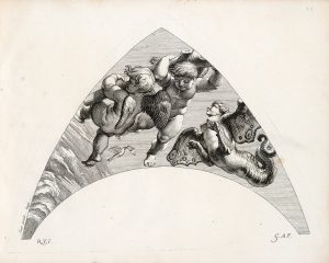 Suite complète de 14 jolies planches gravées en taille-douce par Gérard Audran, représentant les génies et leurs emblèmes disposés dans les angles de la fresque de la Loggia de Psyché peinte par Raphaël dans la villa Farnesina à Rome vers 1517-1518.