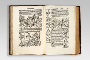 Composée en latin par le physicien et humaniste Hartmann Schedel (1440-1514), la Chronique de Nuremberg est l’un des livres allemands les plus importants du XVe siècle et demeure certainement le plus célèbre des incunables, notamment en raison de l’ampleur de son projet éditorial et par la qualité de sa réalisation.