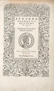 Titre comprenant un bel encadrement formé d’entrelacs, d’arabesques et orné de quatre masques, au centre, médaillon à l’effigie de Suétone. En tête de chacune des vies, ainsi qu’au verso du titre, on trouve un médaillon gravé sur bois représentant le buste de chacun des douze Césars, d’après des médailles antiques (tous ces bois sont en premier tirage).
