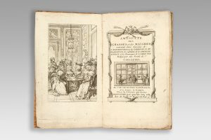 Frontispice représentant la Société des Caillettes dans un salon, et titre gravé placé orné d’une vignette.