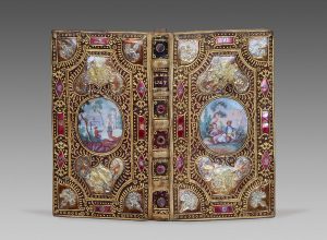 découpés laissant apparaître un décor de paillons, le tout formant encadrement et écoinçons autour d’un médaillon central orné d’une gouache originale sous mica, différente sur les deux plats, dos orné dans les nerfs de pièces de maroquin rouge, vert et bleu, petite roulette intérieure doublure et gardes de tabis rose, tranches dorées (Reliure de l’époque).
