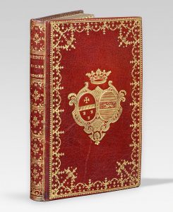 HERVEY (James). Méditations sur les tombeaux. Paris, Lacombe, 1770. In-12, maroquin rouge, dentelle aux petits fers, armoiries au centre, dos lisse orné, roulette intérieure, doublure et gardes de papier dominoté, tranches dorées (Reliure de...