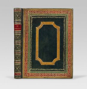 maroquin citron et vert cernant une large bordure de maroquin rouge décoré d’une grecque dorée, compartiment central dessiné par un listel de maroquin citron à angles contournés orné de roulettes, dos à doubles nerfs ornés d’un listel de maroquin rouge, entrenerfs à décor de jeux de compas, dentelle intérieure, doublure et gardes de faille citron, tranches dorées (Bisiaux).