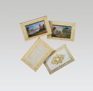 ► RAVISSANT CARTONNAGE DE SOIE ORNÉ D’UNE JOLIE GOUACHE ORIGINALE SOUS VERRE REPRÉSENTANT UN PAYSAGE.