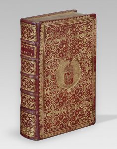 encadrement orné d’un double filet et d’une roulette, décor à la fanfare sur les plats, armoiries au centre, dos orné, petit fer quadrilobé avec pièces d’armes répété dans les caissons, roulette intérieure, tranches dorées (Reliure de l’époque).
