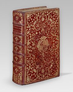 grand décor à la fanfare, armoiries au centre, dos orné, roulette fleurdelisée et fleur de lis répétées, roulette intérieure, tranches dorées (Reliure de l’époque).