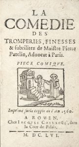 PATHELIN. — La Comédie des tromperies, finesses & subtilitez de Maistre Pierre Patelin, Advocat à Paris. Pièce comique. Imprimé sur la coppie de l’An 1560, Rouen, Jacques Cailloüé, 1656. In-12, maroquin rouge, triple filet doré, dos...