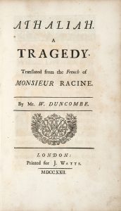 Première édition en anglais d’Athalie (1691), traduite par le poète et écrivain William Duncombe (1690-1769).