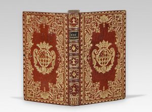 verte, pièces d’armes répétées dans les caissons, roulette intérieure, tranches dorées (Reliure de l’époque).