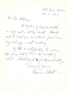 Berenice ABBOTT (1898-1991) photographe américaine. L.A.S., Abbott Maine 7 décembre 1947, à Mr Kellner ; 1 page in-4 ; en anglais.. Le négatif de la photographie de Carl Van Vechten mesure 5 x 7 et n’est donc pas trop petit. Elle va...