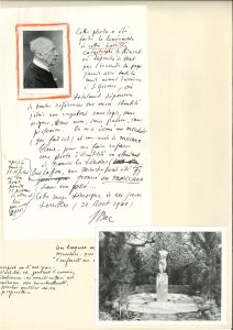 sur des feuilles d’album).. Importante correspondance amicale avec le grand collectionneur, qui devient pour Bac son « cher magicien ». Environ 40 lettres (les premières chronologiquement) sont montées sur de grandes feuilles d’album, ou intercalées dans ces feuilles, avec une variété de documents : des minutes autographes de réponse, dessins originaux de Bac, photographies, lettres de tiers, coupures de presse. Au début de cette correspondance, les deux hommes n’ont pas encore fait connaissance ; une première invitation, dans le but de compléter la « collection Bac » de Foussier, date du 21 mai 1947. Très cordial, Bac parle de la popularité de ses livres, des pillages dont il fut victime pendant l’Occupation, de l’ouverture d’un Musée Romantique auquel il a fourni des objets, et des aléas de la fondation d’une Société des Amis du Romantisme ; il apporte des précisions autobiographiques et évoque ses émissions radiophoniques, des expositions, sa donation au Musée de Montmartre, et les richesses de ses tiroirs (autographes, croquis). Il plaisante à propos du « plaisir d’être posthume » (12 mai 1948), se livre à une légère autodérision, et semble assailli de visiteurs curieux de la petite histoire qu’il s’efforce de satisfaire. Il évoque des personnages contemporains et des souvenirs de ceux du passé : le Dr Pagello, André et Simone Maurois, Julia Bartet, Paul Léon, John Sargent, René Boylesve, Hubert Lyautey, Toulouse-Lautrec, Jules Cambon, Maximilien Vox, Madeleine Clemenceau-Jacquemaire, Robert de La Sizeranne, Jacques-Émile Blanche, Maeterlinck, Joseph Reinach, Paul Bourget, Henri Lavedan, Léon Xanrof, l’abbé Mugnier, Maurice Donnay, Constantin Guys, etc. Quelques souvenirs jugés « singuliers : 1° Gyp a sa robe vitriolée par Alice Regnault, maîtresse d’Octave Mirbeau. Elle arrive ainsi au rendez-vous des Rédacteurs de La Vie parisienne […]. 2° Robert de Montesquiou : je suis avec Mad. Greffulhe le seul invité à une célébration Anatole France avec Mad. Arman. Le soir je me trouve devant délire d’admiration et prend la fuite. D’où rupture instantanée. 3° Anna de Noailles veut faire la connaissance de D’Annunzio. Mad. de Pierrebourg nous invite à cette solennité […]. 20 immortels et le “Bon Bac”… Elle arrive 3 heures en retard. Gabriele 3 h ½ en retard, effaré, bégayant… et la braguette déboutonnée… Il murmure : excusez-moi, j’ai été retenu par Madame Ellutac Sèdnem… (C’est certainement une infâme calomnie). Anna l’entraîne dans la salle à manger… L’illustre assistance attend. Murmures de sacristie… 10 minutes après elle revient avec l’Ange. Elle dit : “je lui ai renoué sa cravate” » (12 mars 1950)… Il ne croit pas que l’association Willy-Colette ait été « favorable à ce garçon, érudit, de bonne éducation, serviable et sociable. Il m’est difficile d’en parler devant l’éblouissement de ce phare du Palais Royal, de cette actualité perpétuelle, de cette divinisation de 3 ou 4 vivants qui, semble-t-il, représentent exclusivement la gloire des Lettres françaises : GideProustClaudelColette. Chaque époque a ses fétiches et aussi ses “Têtes de Turc” » (29 octobre 1950)… « Ma vie a d’étranges imprévus. Il y a autour de moi des “amateurs d’autographes”. Je ne les connais pas. Mais des lettres de moi… n’arrivent pas et aussi celles que je devrais recevoir. Jamais des hommes. Toujours des dames (sur les adresses). Puis des amis de longue date ne viennent plus me voir. On dirait que je suis devenu un objet sans intérêt. Il faut attribuer ces faits étranges à un état, ni local ni social mais cosmique. Une perturbation qui touche tout ce qui existe, y compris les relations humaines, jadis normales […] Mon inaction me surprend comme un phénomène inconnu. Jamais je n’ai été pris d’une telle lassitude de créer » (30 juillet 1951)… Certaines lettres sont illustrées de dessins en remerciement de divers envois, dont deux autoportraits ; d’autres représentent un dragon (« St Georges c’est vous »), un « Boche », un accident de voiture, une orange aberrante, des cartouches d’encre, des fleurs ; des photos originales sont collées en vignette à certaines lettres. La dernière lettre date de moins d’un mois avant son décès : Bac fait une caricature de Voltaire aux crayons de couleur et confesse : « Je me sens… m’en aller… La fatigue de vivre augmente. Mais c’est une raison de plus de désirer vous voir »… On joint 7 L.A.S. de Foussier à Bac.