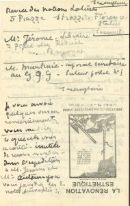 critique de L’Action Française ayant écrit sur mon livre L’Esthétique fondamentale et traditionnelle, une étude, il me vient de partout des demandes de ce volume ». Il la prie de récupérer la clé auprès de Pauline, d’aller chercher des exemplaires dans la grande armoire de son atelier, et de les envoyer de sa part aux 4 adresses qu’il lui indique… Il envoie quelques vers (non joints) en remerciement.