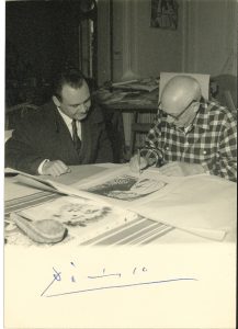 Pablo PICASSO (1881-1973). Photographie signée « Picasso », [1956] ; 14,7 x 10,5 cm.. Photographie originale représentant Picasso à la Californie signant des lithographies aux côtés de Pierre Bertrand éditeur du livre de Cocteau, Picasso...