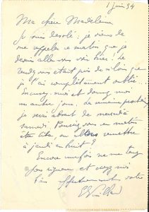 Édouard VUILLARD (1868-1940). L.A.S., 1er juin 1934, à Mlle Madeleine Denis ; 1 page petit in-8, adresse au dos (pneumatique).. « Je suis désolé : je viens de me rappeler ce matin que je devais aller vous voir hier ! »… Il propose des...