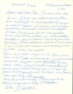 Grekoff. Les Arques 18.7.1965. Le Dr. Wehrly, directeur de la Kunsthaus [de Zurich] « m’a dit qu’il aimerait que 4 ou 5 de mes tapisseries les plus réussies, car il aime un grand nombre des dessins et gouaches ». Zadkine ira vers le 20 août aux ateliers Pinton voir et choisir les tapisseries. La Kunsthaus enverra des camions pour chercher les sculptures vers la fin août, donc tout doit être prêt. « Je commence très, très lentement à travailler, mais ni les circonstances, ni le cœur ne sont pas encore dirigés vers la paix de l’âme, et cette dernière n’est pas revenue en moi et l’âme est angoissée et vide ». Il n’y a rien à faire qu’attendre ; il termine en russe… Paris 5.11.1965. Il rentre de Saint-Gall en Suisse « où j’ai fait dix lithographies pour un album qui serait prêt dans un mois. Les photos de l’église sont d’un très grand intérêt et je le reregarderais encore et finirais par écrire quelque chose poussé par la beauté et la pénétration que ces photos iradient »… Il a mal au genou et traîne la patte, la petite famille va bien et l’attend à Paris. Il attend ses sculptures qui reviennent de Zurich… Les Arques dimanche 19.3.66. Le soleil merveilleux du Lot « réchauffe le vieux scelet. Le paysage se réveille à peine et chaque jour un chant nouveau d’un oiseau revenu est entendu au loin ». Il reçoit beaucoup de lettres, et de commandes. Les commandes de Pinton et des autres n’avancent pas : « Les gens sont terribles » ; il pense rentrer plus tôt à Paris, où il a rendez-vous, ainsi qu’à Cologne, pour son exposition chez Lempertz…. [28-7-67], en russe.