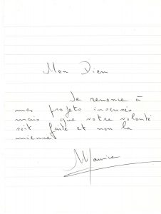 Maurice Béjart. P.A.S. « Maurice » ; 3/4 page in-8 sur papier ligné.. Prière. « Mon Dieu Je renonce à mes projets insensés mais que votre volonté soit faite et non la mienne »…