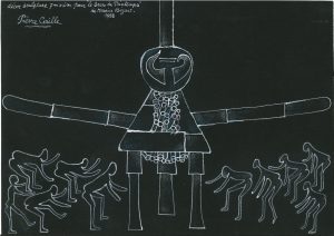Pierre Caille (1911-1996) sculpteur, peintre, costumier et joaillier belge. Dessin original légendé et signé en haut à gauche, 1958 ; 21 x 29,5 cm sur papier noir.. Dessin exécuté à l’encre blanche et verte, sur une feuille de papier...