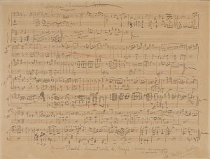 suivant les renversements de l’accord de 7e diminuée » et « reprendre avec la gruppetto »), et cinq pièces complètes, chacune sur 2 systèmes de 2 portées, datées et numérotées (?) en marge : Allto assai risoluto, en sol majeur à 6/8 (32 mesures), « Xbre 196 » ; Vif, en sol mineur à 2/4 (26 mesures), « Xbre 197 » ; Lent, en ut à 3/8 (25 mesures), « Xbre 198 » ; All° molto, en mi mineur à 2/2 (70 mesures sur 4 lignes), « Xbre 199 » ; Chaud (quasi allegro), en sol bémol majeur à 2/8 (22 mesures sur 3 lignes) lus ritournelle (9 mesures), « Xbre 200 ». Attestation et ex-dono par la belle-fille du compositeur, Mme Marcelle Bretton-Chabrier, au ténor belge Marcel Claudel (1900-1981), qui chanta le rôle du comte de Nangis à la reprise du Roi malgré lui à l’Opéra-Comique le 6 novembre 1929 : « à Monsieur Claudel, charmant comte de Nangis, souvenir reconnaissant, 6 novembre 1929. M. Bretton Chabrier ».