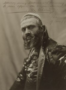 Feodor CHALIAPINE (1873-1938). Photographie avec dédicace autographe signée, Paris 19 juin 1909 ; 27 x 20,5 cm sur carte 46 x 36 cm à la marque du photographe.. Beau portrait de Chaliapine en costume dans le rôle-titre de Boris Godounov, par...