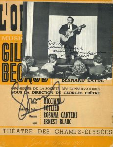 CHANSON. 8 pièces signées ou dédicacées, XXe siècle ; formats divers.. Photos, coupures de presse, affichette : Joan Baez, Gilbert Bécaud, Georges Brassens, Félix Leclerc, Manitas de Plata, Claude Nougaro, Michel Simon, etc.