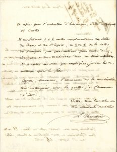 pour ses musiciens : « J’ai besoin pour ma Cantate, salle du Trône, 81 cartes. Pour l’Intermède de MMrs Boieldieu et Berton, Salle du St-Esprit, 46 cartes. Et enfin pour l’orchestre d’harmonie, Salle du Banquet, 12 cartes ». Il demande en outre quelques cartes supplémentaires, par précaution en cas de changements de musiciens dans ces trois orchestres…