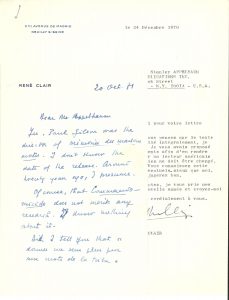 René CLAIR (1898-1981) cinéaste. 5 L.S. et une L.A.S., Neuilly-sur-Seine 1970-1971, à Stanley Appelbaum, Dover Publications, à New York ; 8 pages et demie in-4 ou in-8 (la L.A.S. en anglais).. Projet d’une édition américaine de Cinéma...