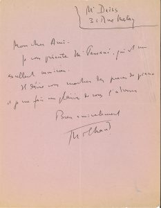 Darius MILHAUD (1892-1974). L.A.S., à l’éditeur Raymond Deiss ; sur 1 page in‑4.. Il lui présente Émile Passani, « un excellent musicien. Il désire vous montrer des pièces de piano et je me fais un plaisir de vous l’adresser »...