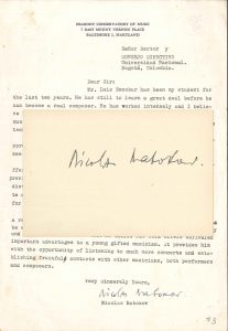 Nicolas Nabokov (1903-1978). L.S., Baltimore (Maryland) [vers 1945], au recteur de l’Université de Bogota en Colombie ; 1 page in-4, en-tête Peabody Conservatory of Music (petite fente au pli) ; en anglais.. M. Luis Escobar, son élève...