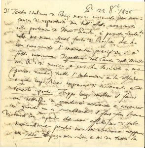 sur le Théâtre Italien de Paris et sur Rossini. . Le Théâtre Italien de Paris, à moitié ruiné par manque de répertoire, mais tout à fait assassiné par le départ de Mme Pasta, est finalement tombé entre les mains de Paër. Il rage contre ce fourbe de Rossini qui, connaissant ce précipice imminent, s’est fait nommer Inspecteur du chant de l’Académie royale de musique, et l’a ainsi laissé (pauvre diable) dans l’embarras, et la tâche quasi impossible de tenir ouvert le théâtre, et sans toucher un sou de plus pour ça, avec toutes les responsabilités. La seule ressource pour ce pauvre théâtre est la Cinti, mais elle ne peut chanter dans deux théâtres à la fois… Il parle encore de Rossini, qui songe certainement à partir ; ses œuvres plaisent, mais il a beaucoup d’antagonistes et de critiques ; le Vicomte [de La Rochefoucauld] le protège et fait mettre dans les journaux des cris de victoire, de régénération du grand opéra, et mille autres bêtises. Le brave Talma est mort…. On joint une intéressante L.S. de l’éditeur de musique milanais Giovanni Ricordi au journaliste Luigi Monti, de la Gazzetta Privilegiata de Bologne (8 juin 1846 ; 2 p. in-4 à son en-tête, adresse).